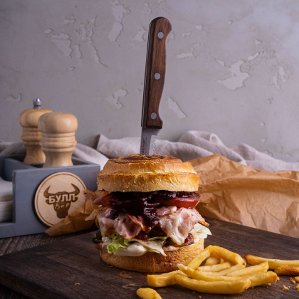 Большой бургер с говяжьей котлетой, сыром чеддер, болгарским перецем, айсбергом, луком, беконом, маринованными огурцами, помидором и халапеньо. Соусы шрирача и домашний майонез