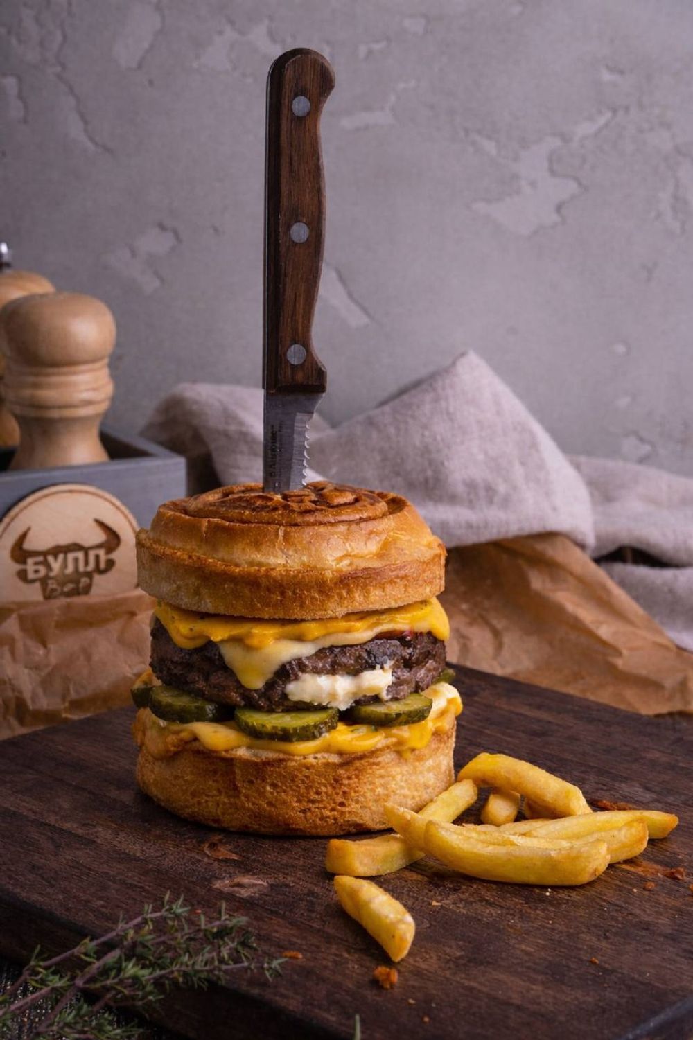 Говяжья котлета с камамбером, лук фри, соус горчичный, соус Бургер, огурцы маринованные