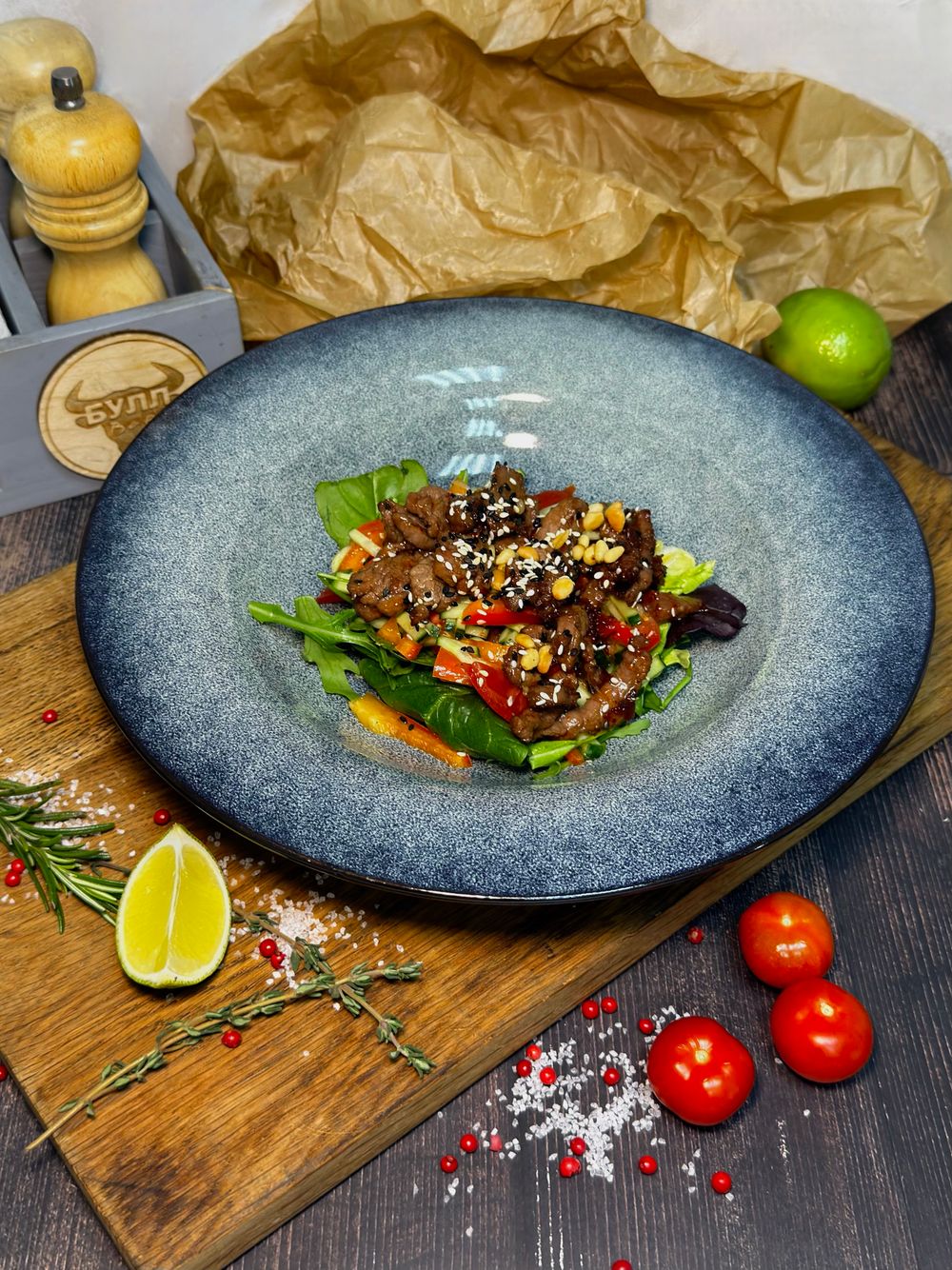 Говяжья вырезка, свежие огурцы, болгарский перец, помидоры, микс салата, соус сладкий чили, оливковое масло, кунжутное масло, кунжут, кедровый орех, растительное масло