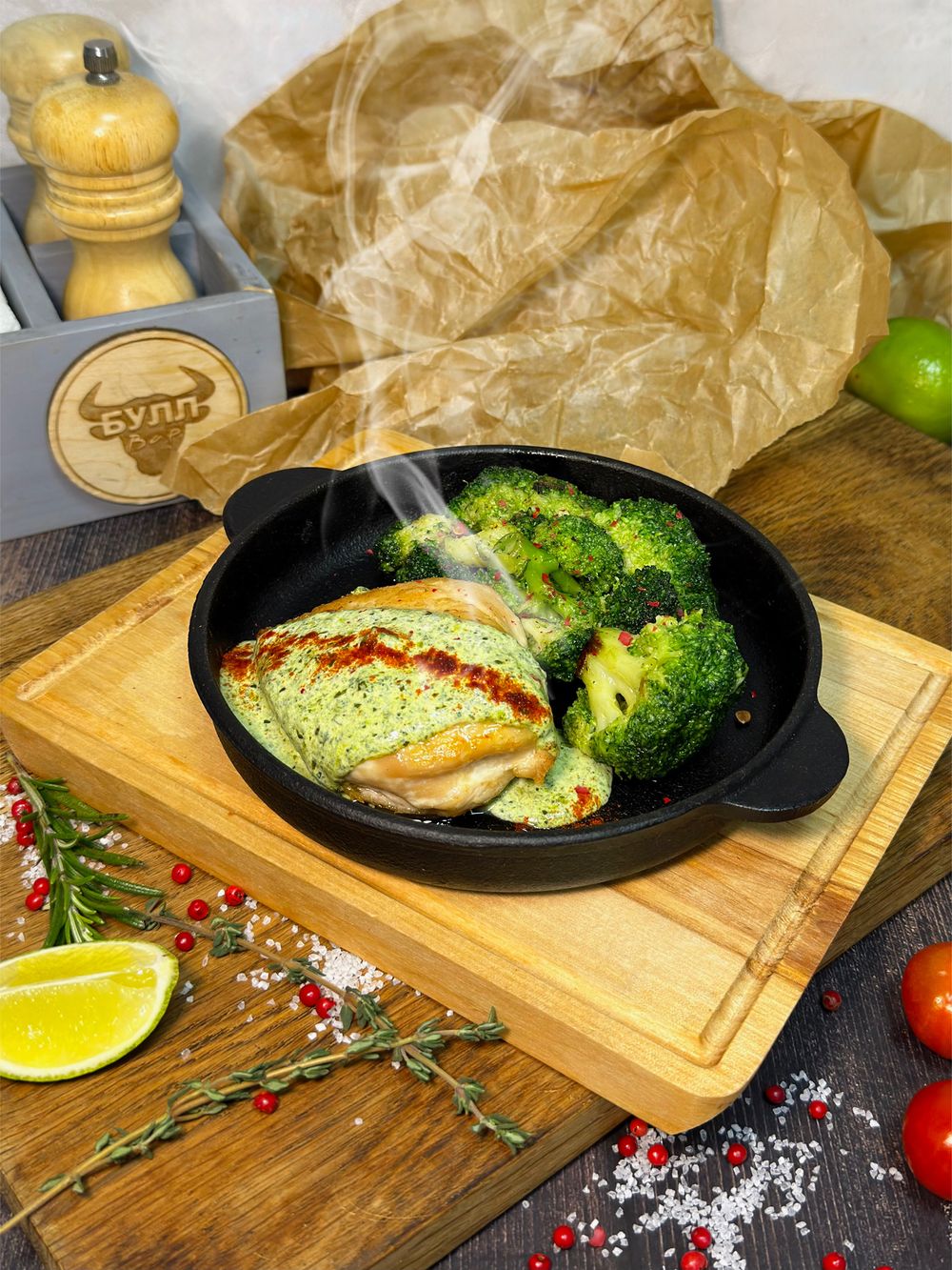 Филе куриное, брокколи, специи, чеснок, йогуртовый соус, соус чимичурри
