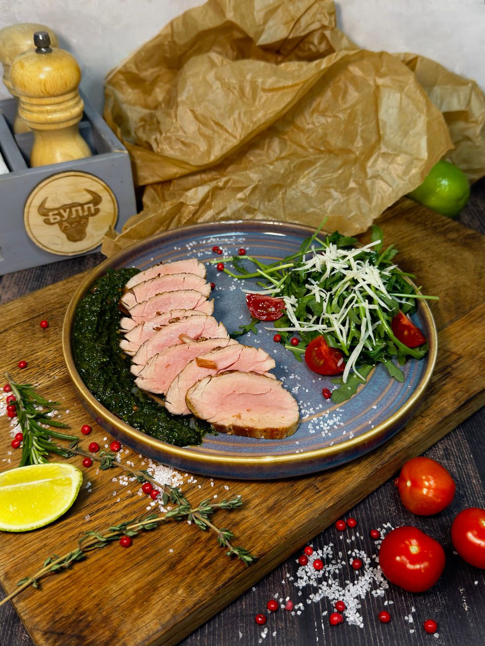 Свиная вырезка, руккола, соус чимичури, пармезан, томаты черри
