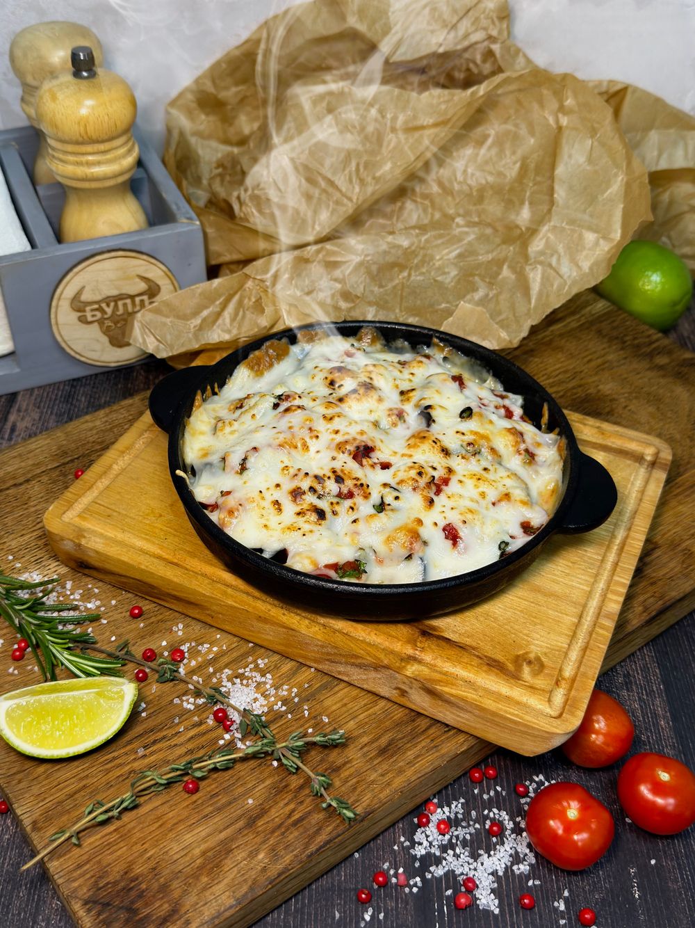 Баклажаны, томаты, моцарелла, кинза, чеснок, томаты в собственном соку