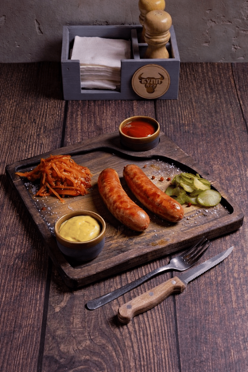 Подается с тушеной капустой, соус на выбор: кетчуп / дижонская горчица