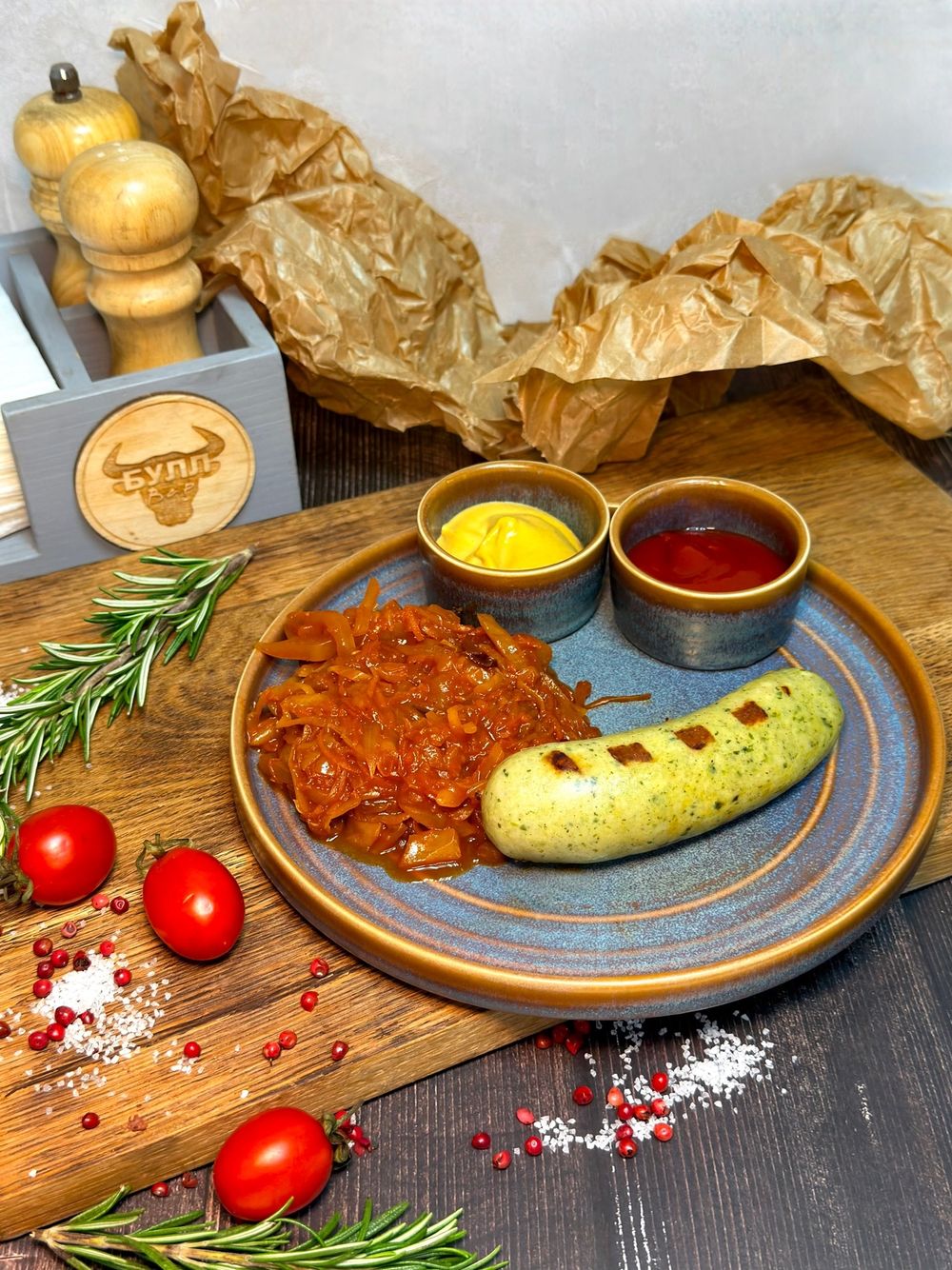 Подается с тушеной капустой, соус на выбор: кетчуп / дижонская горчица