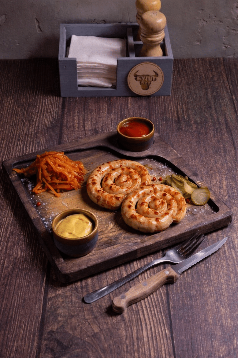 Подается с тушеной капустой, соус на выбор: кетчуп / дижонская горчица