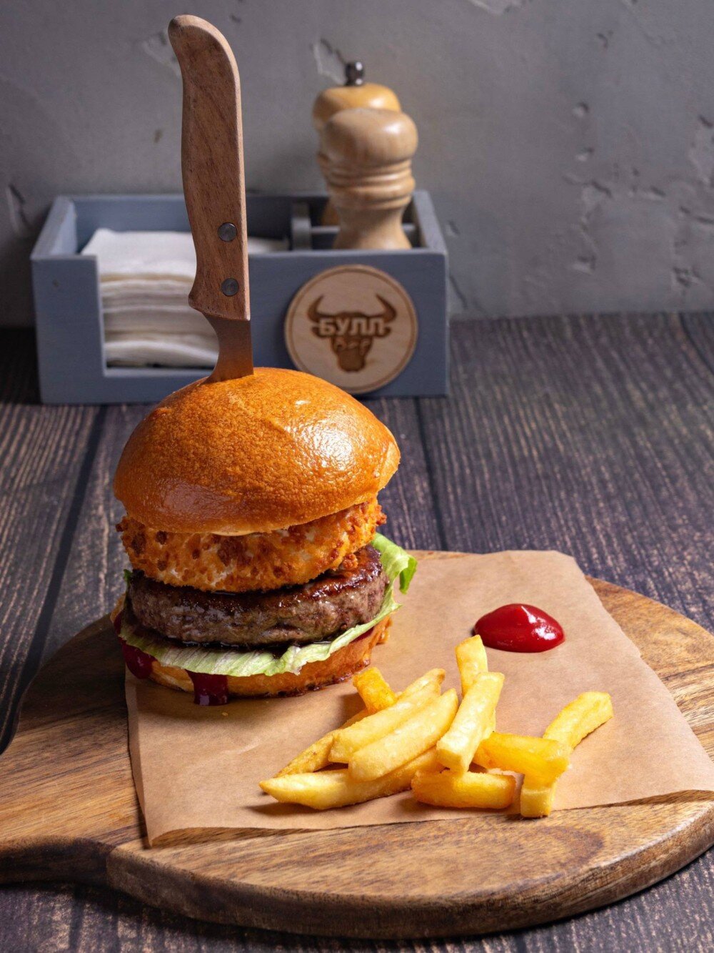 Изысканный французский бургер с камамбером, сочной говяжьей котлетой и салатом айсберг. Соусы: сырный, ягодный.