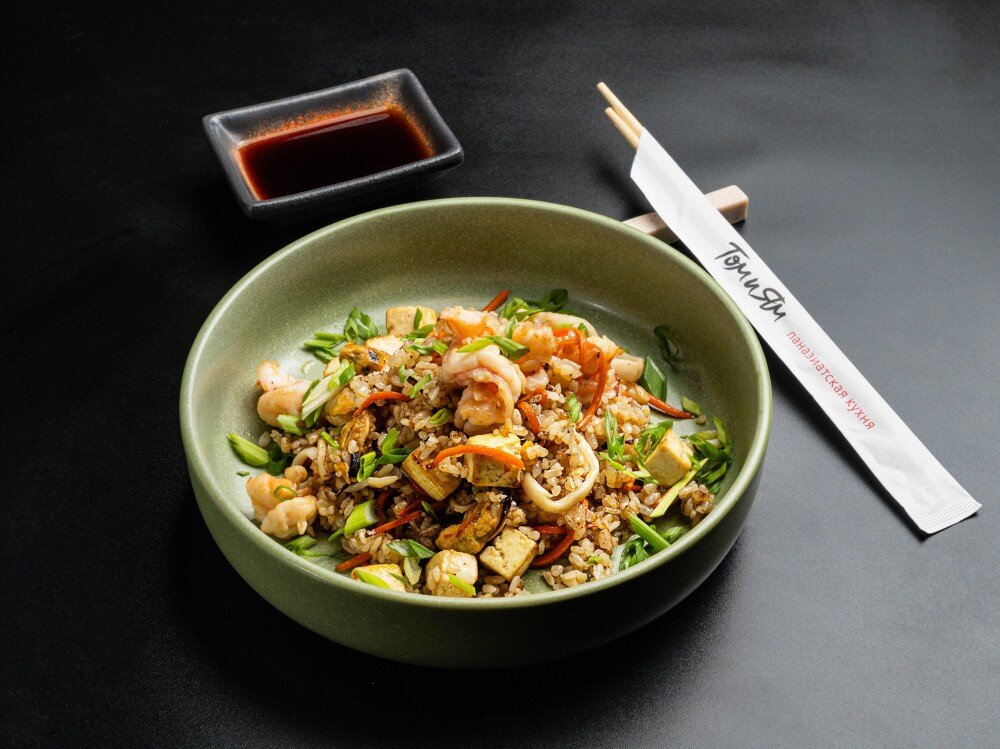 Кантонский рис, обжаренный с мидиями, кальмарами, креветками, морковью, ломтиками тофу, имбирем, чесноком и ферментированным рыбным соусом. Украшается зеленым луком и кунжутом.