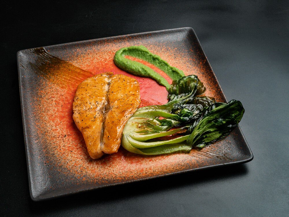 Нежное филе лосося подается с бархатистым пюре из эдамаме и брокколи и хрустящей жареной капустой пак-чой с легкой карамелизацией.