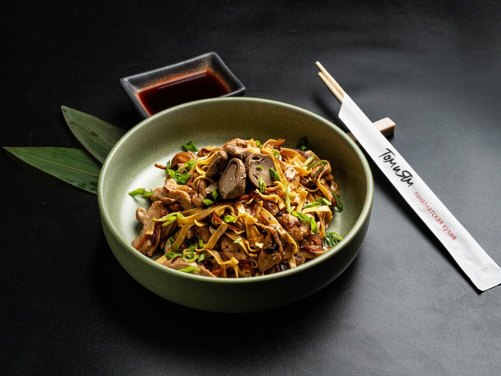 Нежная яичная лапша, обжаренная со свининой, красным луком, чесноком и хрустящим арахисом. Богатый вкус дополняют грибы цаогу, зеленый лук и мягкая сладость чили-соуса, создавая идеальный баланс остроты и насыщенности.