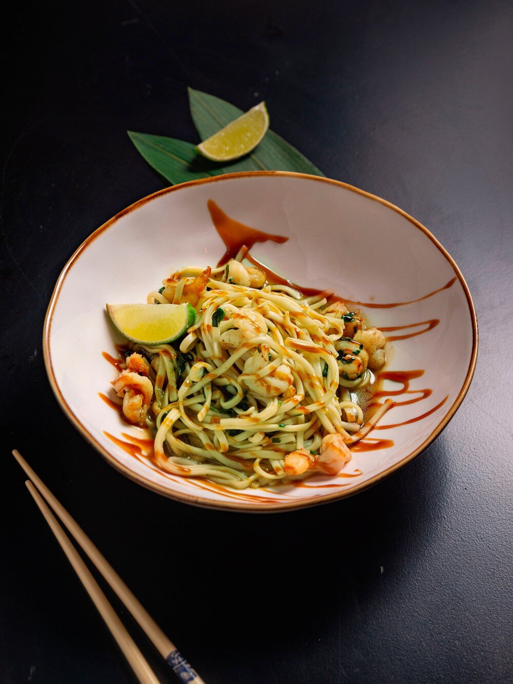 Пшеничная лапша с обжаренными тигровыми креветками со шпинатом в устрично-лаймовом соусе.