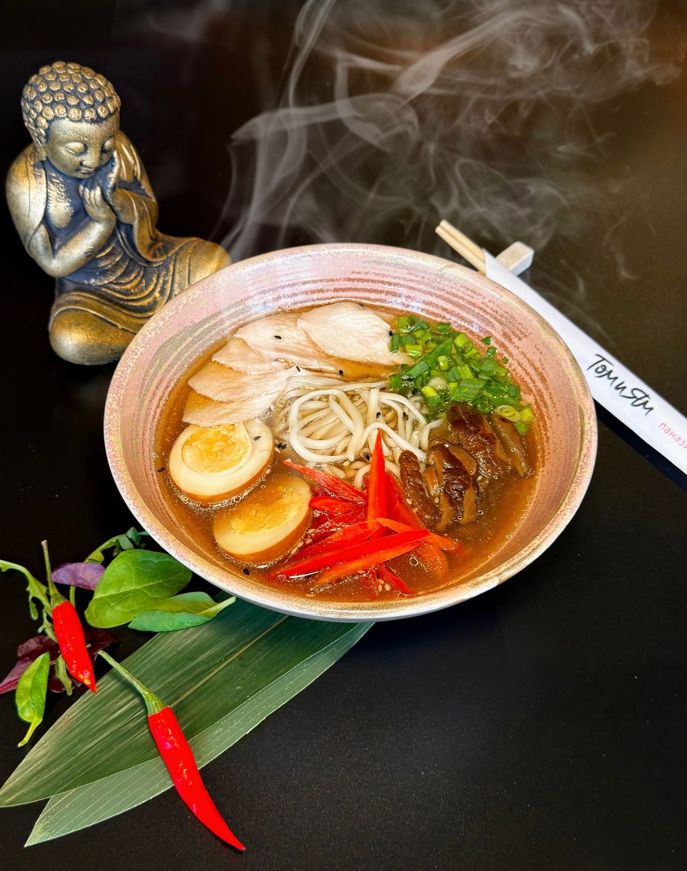 Куриный бульон с пшеничной лапшой, куриным филе, маринованным яйцом, грибами шиитаке, сладким перцем и зелёным луком; при подаче — чеснок и кунжут.