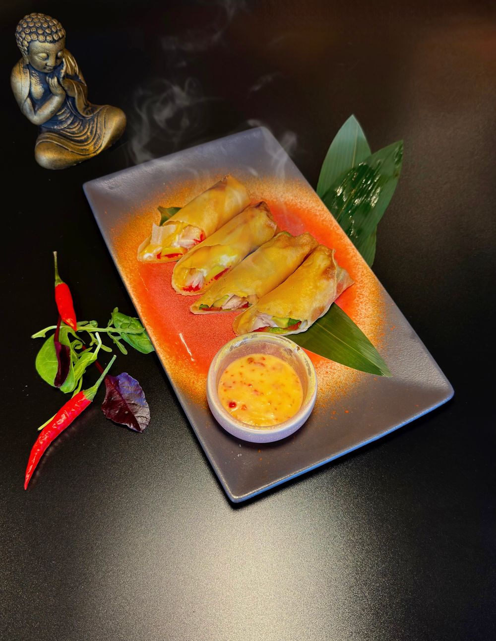 Хрустящие спринг-роллы с куриным филе, авокадо, чеддером, творожным сыром и икрой масаго. Подаются с соусом на основе японского майонеза и сладкого чили.