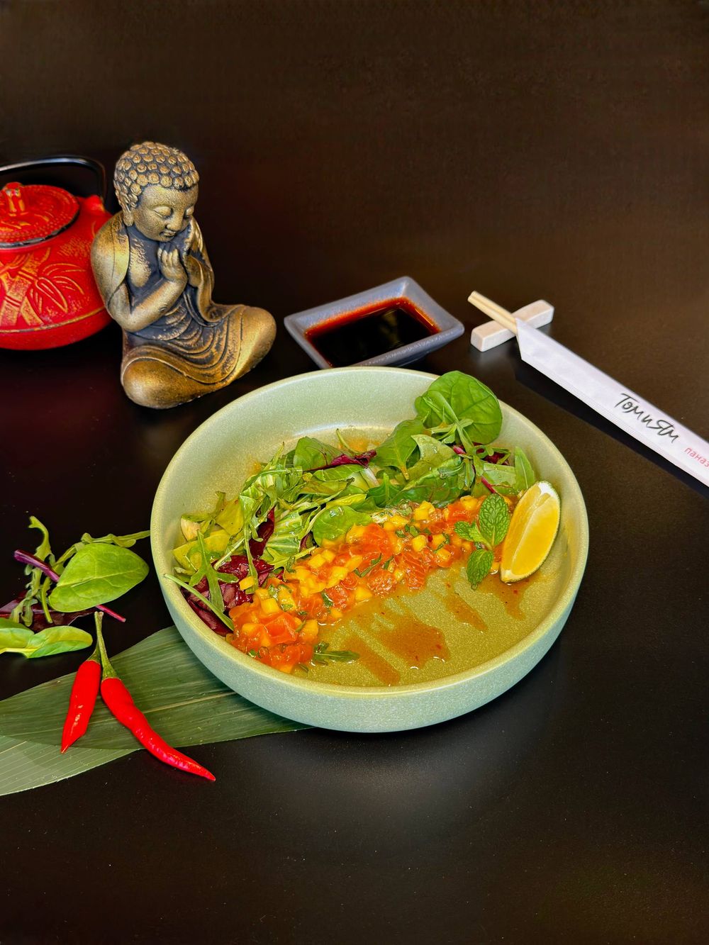Свежий лосось, сочное манго, пакчой, микс салатов, базилик и мята с тайской заправкой.