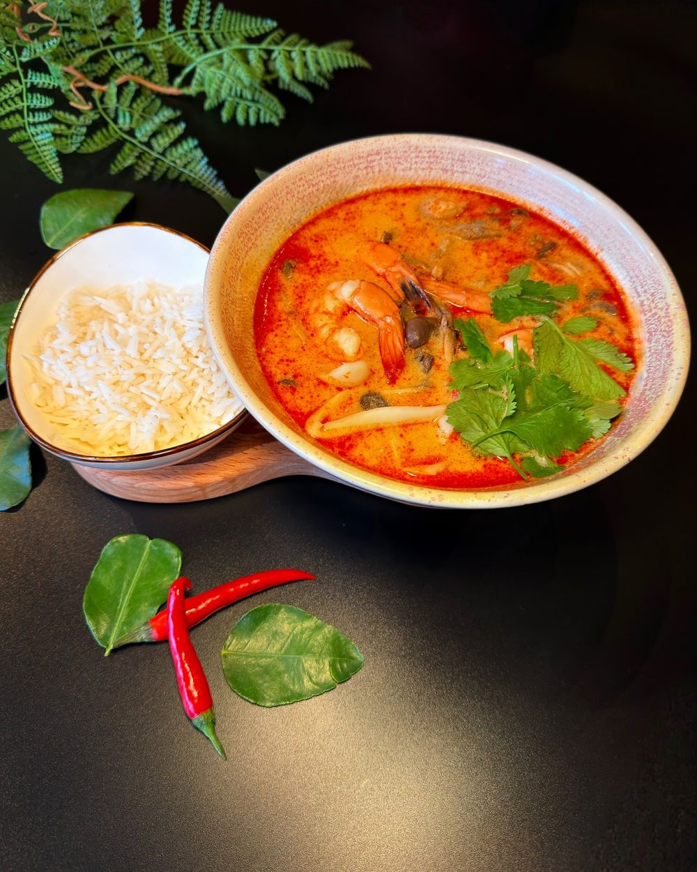 Приготовленный по классическому тайскому рецепту на курином бульоне и кокосовом молоке с тигровыми креветками, кальмарами, лемонграссом, листьями лайма, вешенками и кинзой. Подается с порцией риса.