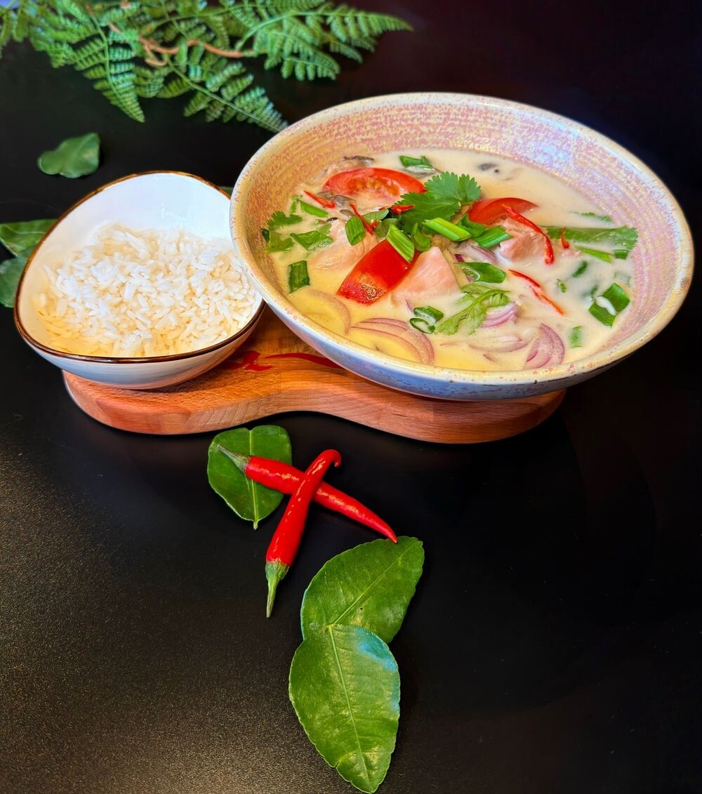 Нежный тайский суп на курином бульоне и кокосовом молоке с листьями лайма, курицей, лемонграссом, вешенками, томатами, красным луком, чили перцем, зелёным луком и кинзой. Подается с рисом.