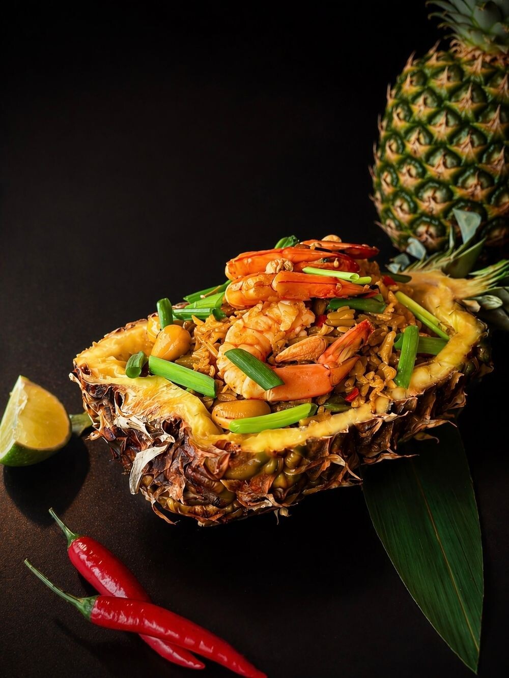 Ароматный пряный жареный рис кусочками ананаса, креветками и орехами кешью.