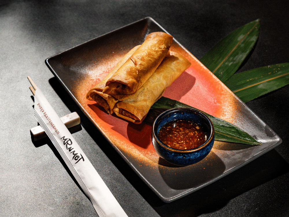 Хрустящие рулетики из рисовой бумаги с начинкой с коктейльных креветок, капусты, моркови, лука и чеснока. Подается соусом сладкий чили.