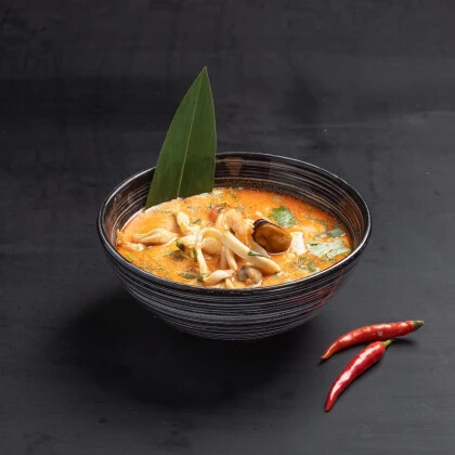 Приготовленный по классическому рецепту суп на кокосовом молоке с курицей. Подается с рисом.