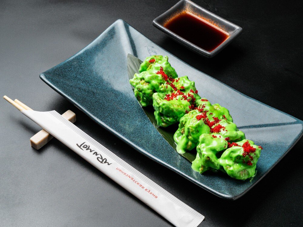 Жареные во фритюре креветки в оригинальном соусе из сгущенного молока, майонеза и васаби, украшаются икрой масаго.