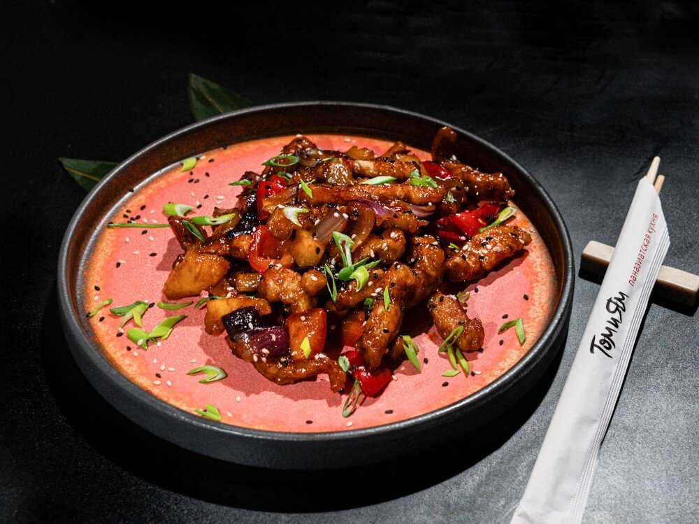 Блюдо является неотъемлемой частью китайской кухни. В нем прекрасно сочетается свинина, ананас, болгарский перец и красный лук в кисло-сладком соусе.