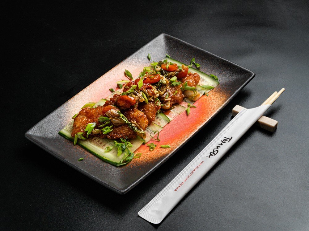 Нежное филе трески, обжаренное в сухарях панко, в кисло-сладком соусе, с пекинской капустой, помидорами черри и слайсами свежего огурца.