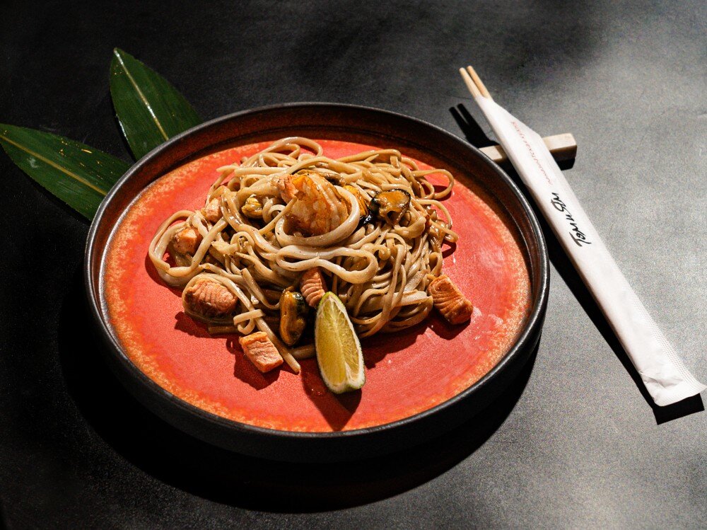Пшеничная лапша Удон с креветкой, лососем, кальмаром и мидиями под сливочно-устричным соусом из кокосового молока. Подается с долькой лайма.