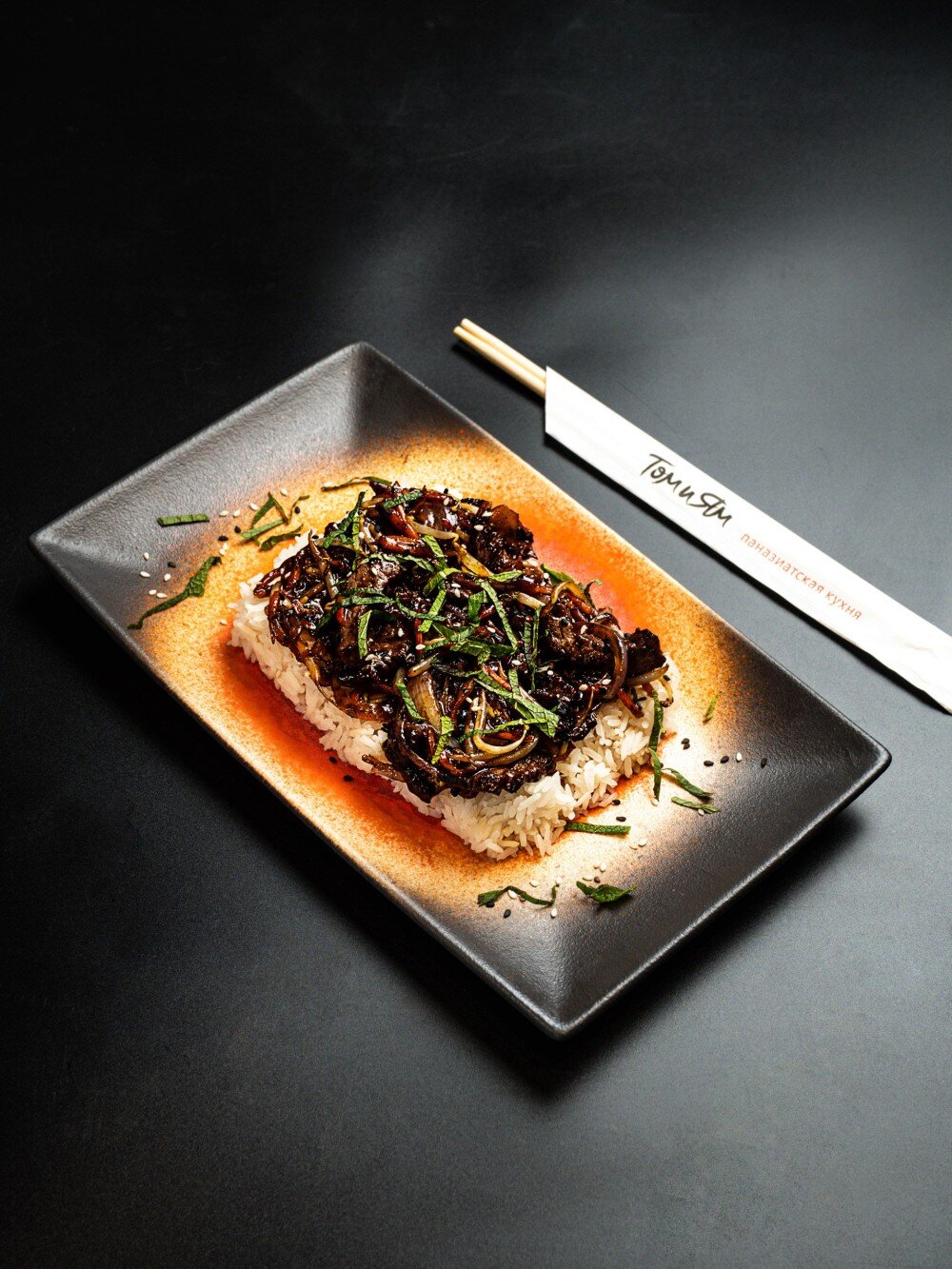 Говядина, маринованная в соусе бульгоги и обжаренная с красным луком и ростками сои в устрично-томатном соусе. Подается на подушке из риса, украшается мятой.