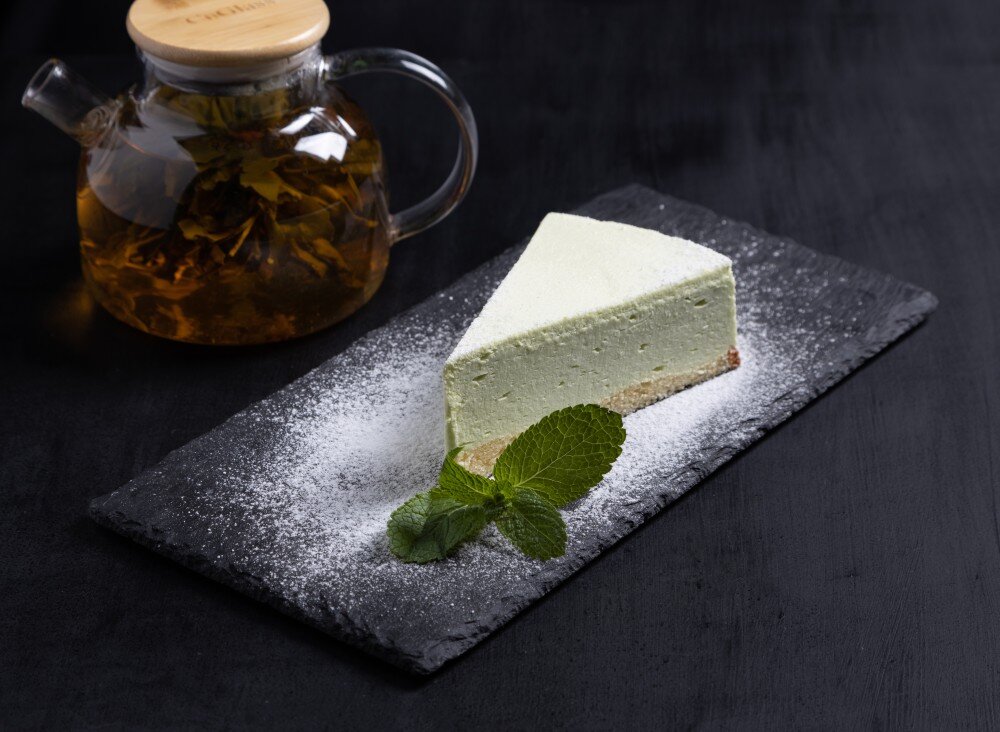 Экстракт чая матча, творожный сыр, сахар, сливки, желток, масляный бисквит, желатин