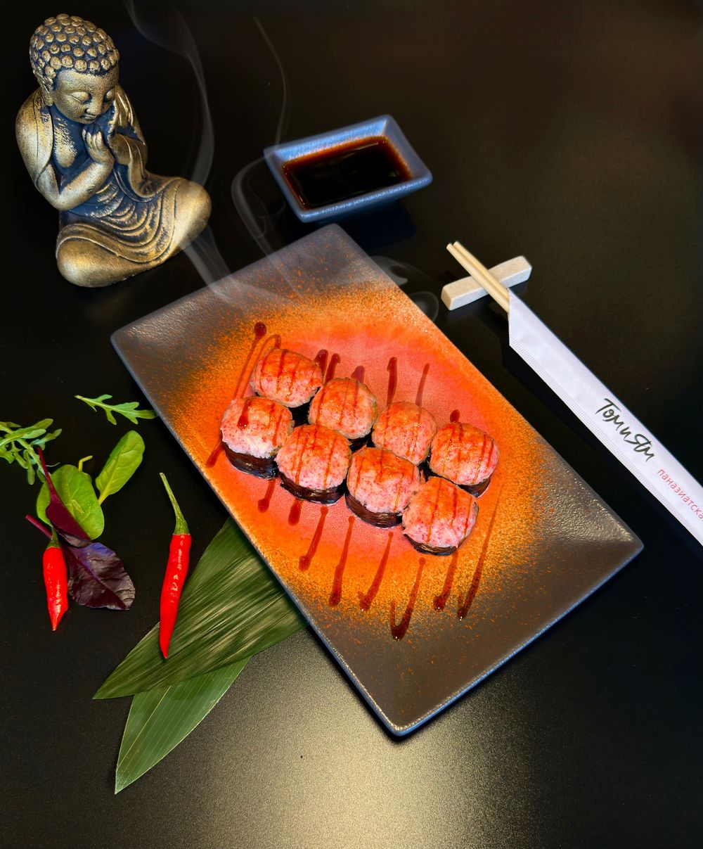 Ролл с угрем, творожным сыром и огурцом, запечённый с моцареллой, японским майонезом и икрой масаго.