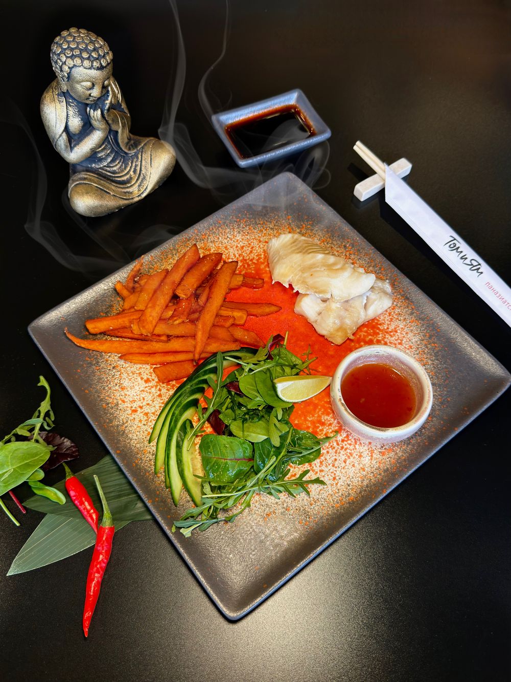 Нежное филе трески, приготовленное на пару в тайском соусе, с хрустящим бататом фри и свежим миксом салата.