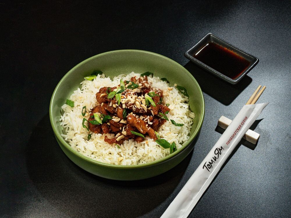 Мягкое куриное бедро, обжаренное в имбире, чесноке и соевом соусе, обжаренное в пикантном сладком чили. Подается с зеленым луком, хрустящим арахисом. Подается с рисом