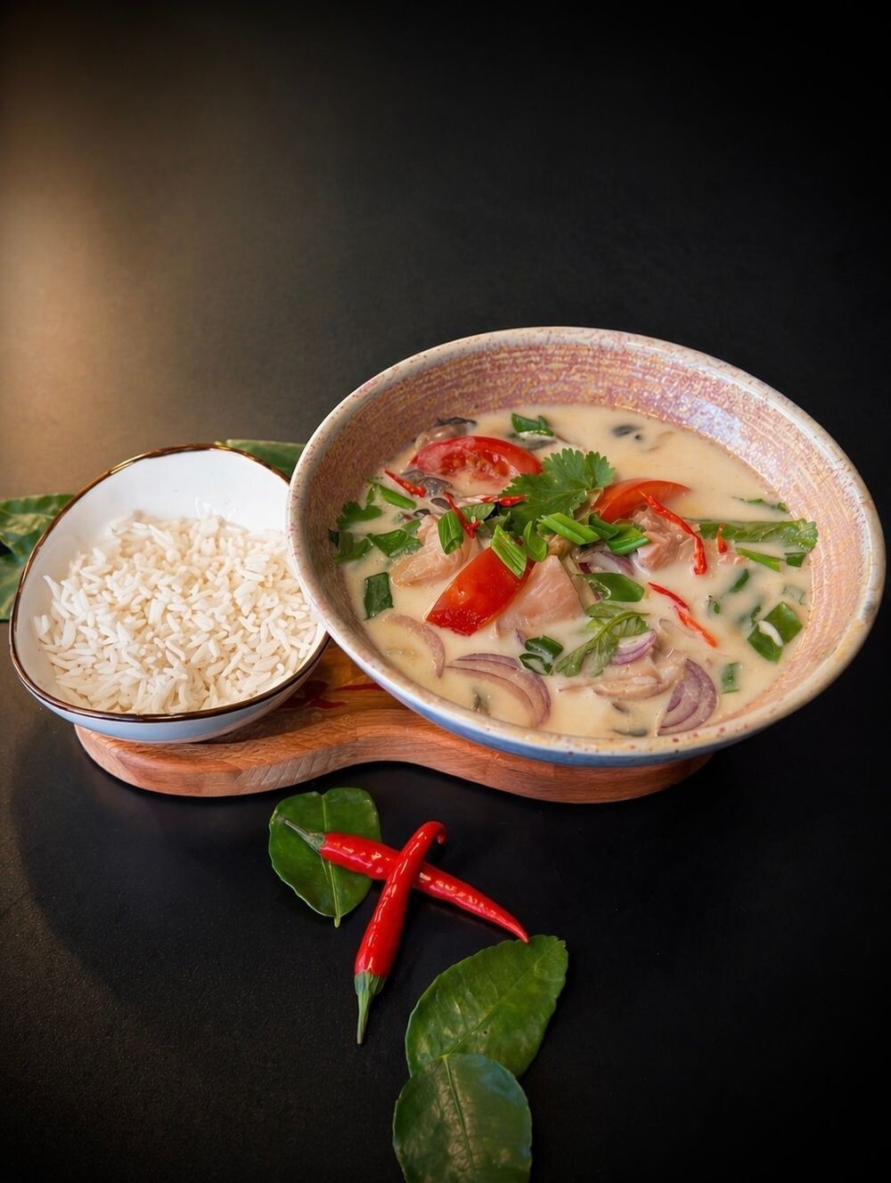Приготовленный по классическому тайскому рецепту на курином бульоне и кокосовом молоке с курицей, лемонграссом, листьями лайма, вешенками и кинзой. Подается с порцией риса.