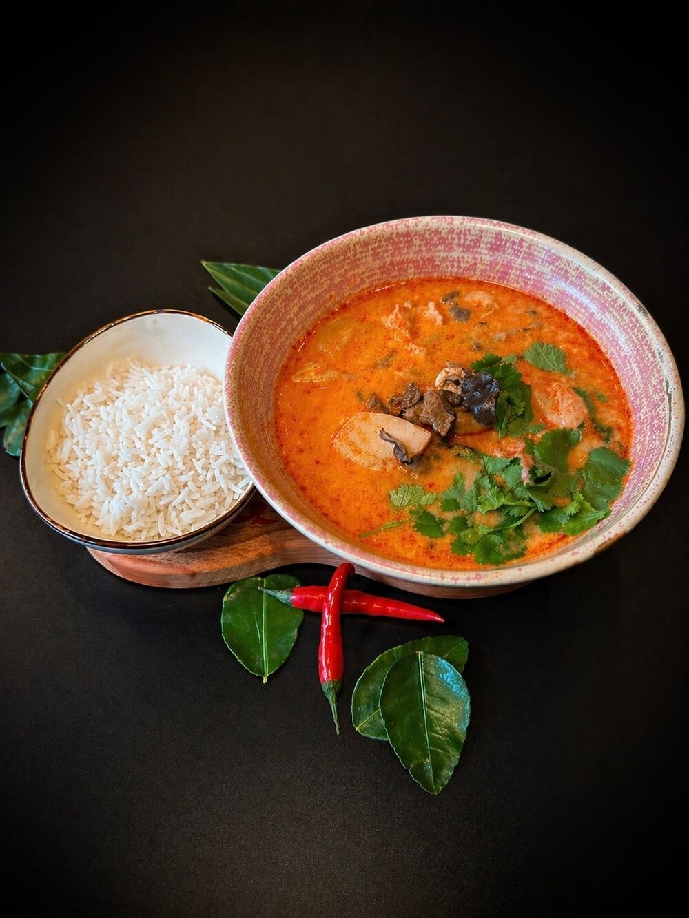 Нежный тайский суп на курином бульоне и кокосовом молоке с листьями лайма, тигровыми креветками, кальмарами, лемонграссом, вешенками, томатами, красным луком, чили перцем, зелёным луком и кинзой. Подается с рисом.