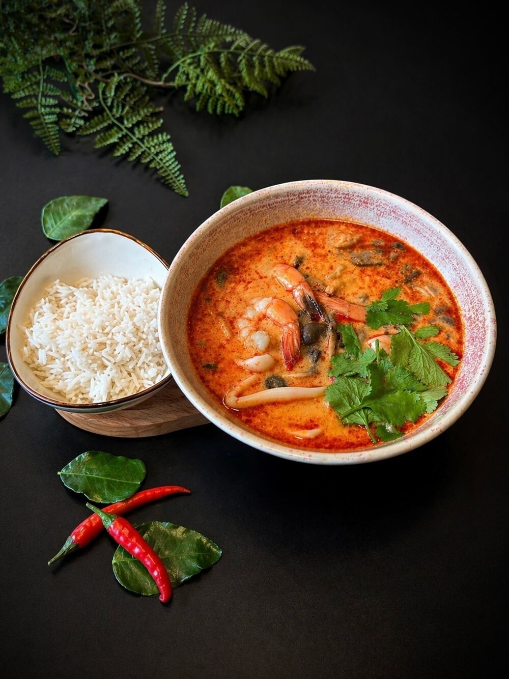 Нежный тайский суп на курином бульоне и кокосовом молоке с листьями лайма, тигровыми креветками, кальмарами, лемонграссом, вешенками, томатами, красным луком, чили перцем, зелёным луком и кинзой. Подается с рисом.