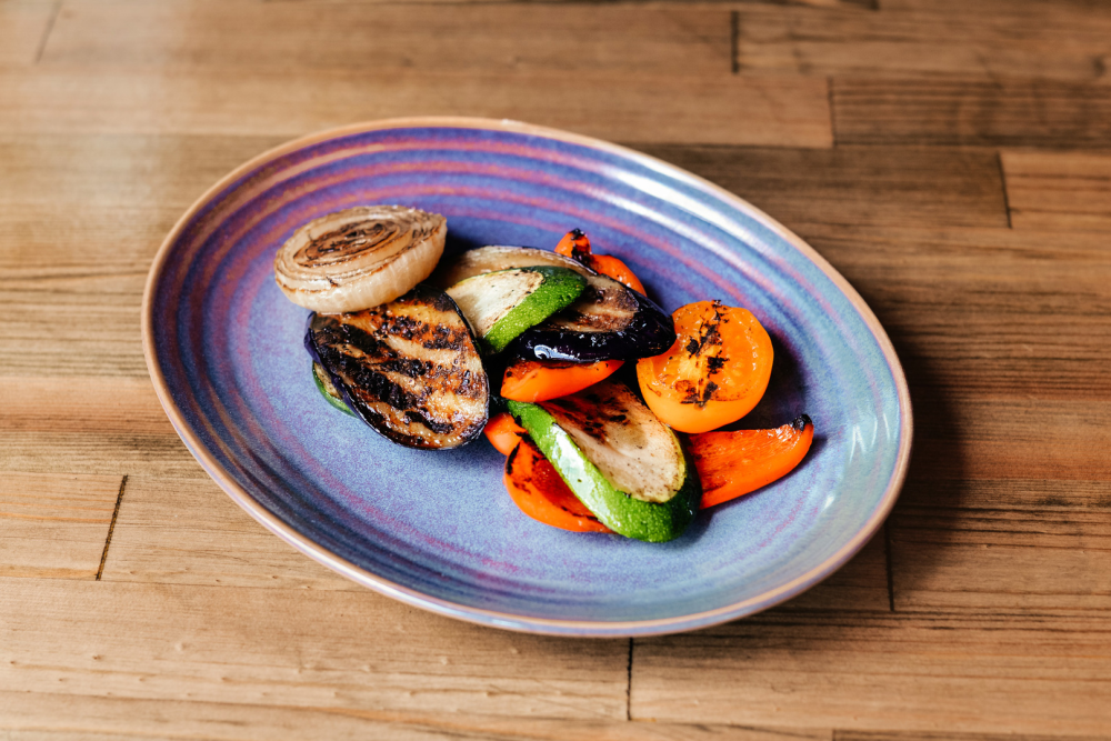 Сладкий перец, кабачки, баклажаны, кукуруза обжаренные на гриле с чесночным маслом и соусом песто.