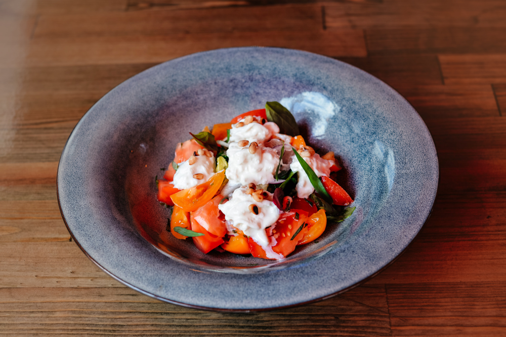 Легкий салат с нежным сыром страчателла и сочными томатами, микс-салатом и кедровыми орехами, заправленный соусом песто..