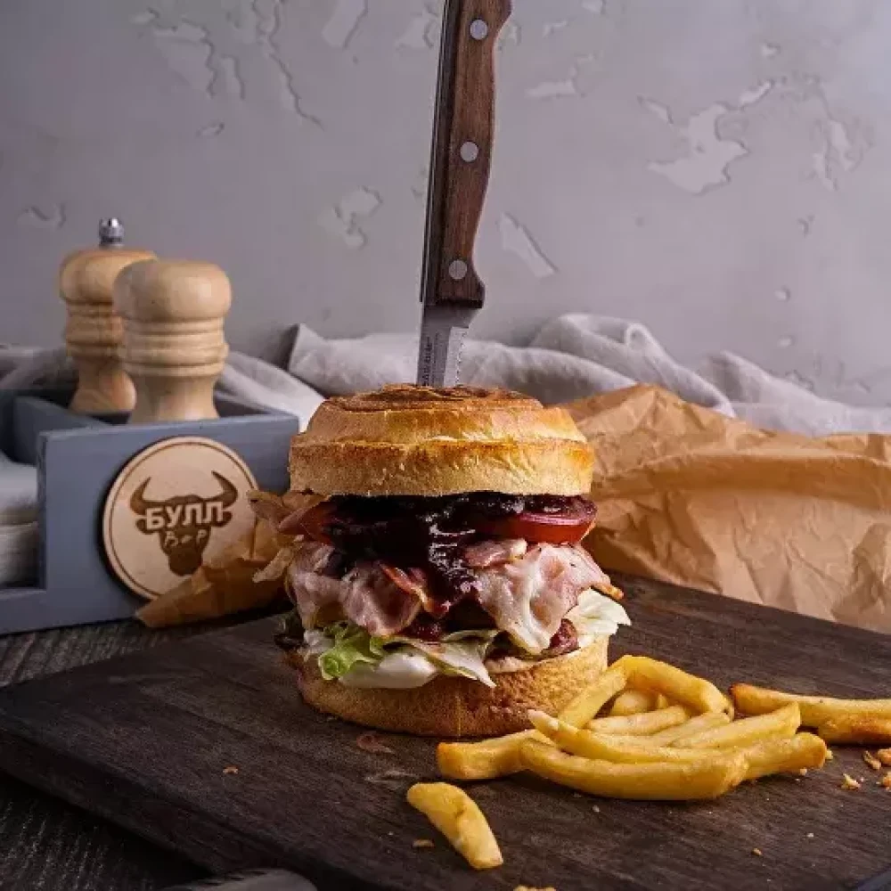 Большой бургер с говяжьей котлетой, сыром чеддер, айсбергом, помидорами, жареным беконом, луком и маринованными огурцами. Соусы курбург и кетчуп