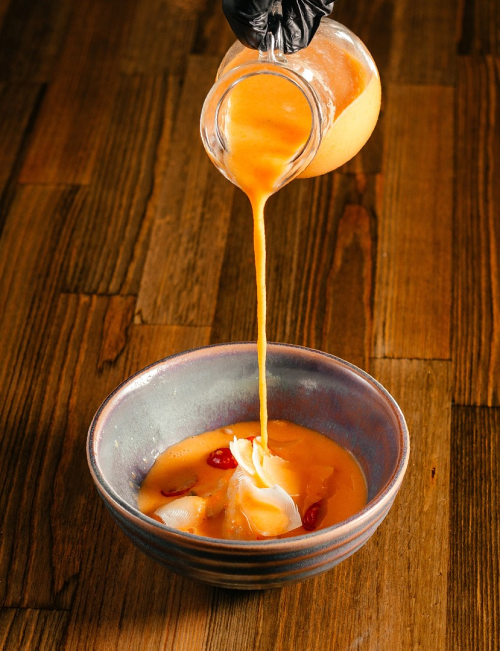 Суп из ароматного сыра чеддер с охотничьими колбасками. Подаем с хрустящими сухариками и пармезаном.